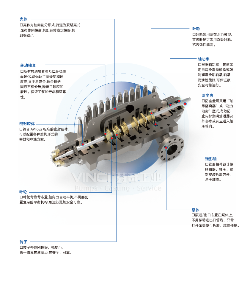 ● 葉輪采用對稱布置,軸向力自動平衡,沒有復(fù)雜的平衡盤、平衡鼓等平衡機(jī)構(gòu)。