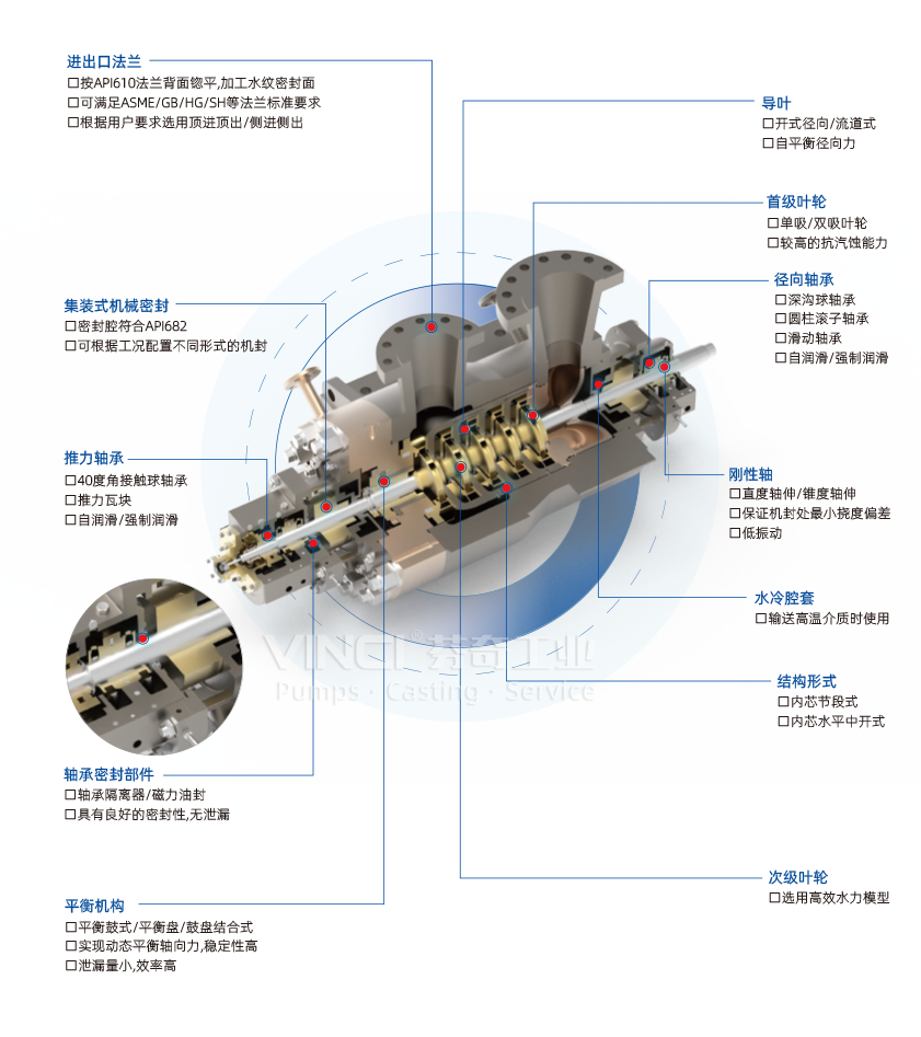 VBBR-T API 610 BB5型式離心泵用于油田煉化鍋爐給水及海上鉆井平臺(tái)等相關(guān)領(lǐng)域,對(duì)高溫高壓高轉(zhuǎn)速運(yùn)行工況提供良好的水力和機(jī)械性能,集裝式轉(zhuǎn)子芯包方便安裝拆卸,可選背靠背結(jié)構(gòu)設(shè)計(jì)平衡重載荷軸向力。