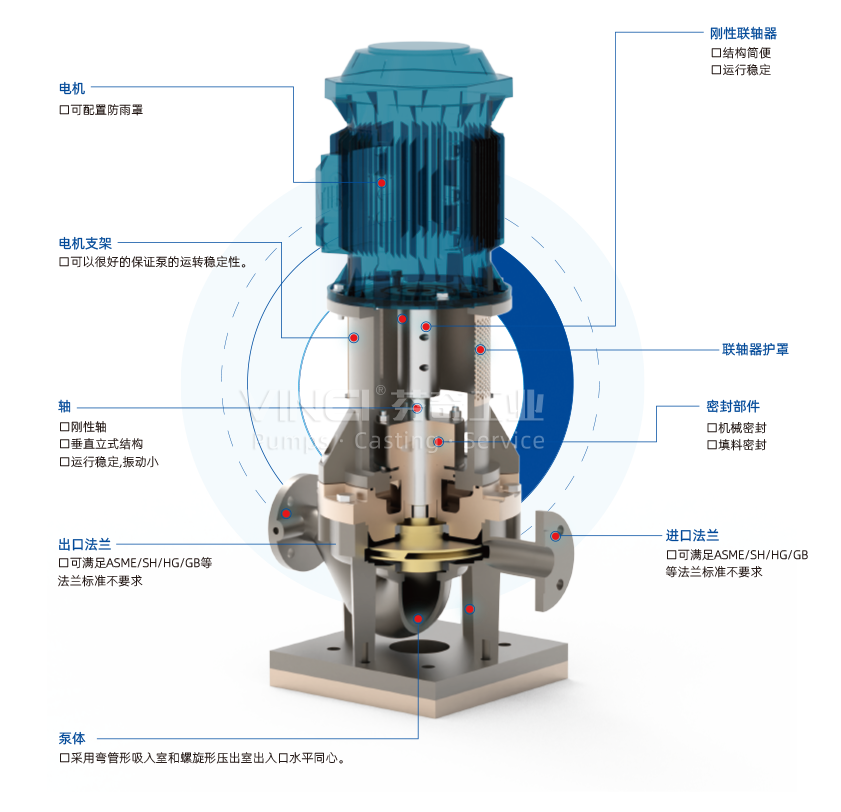◎泵為立式結(jié)構(gòu),進(jìn)出口口徑相同,且位于同一中心線上,占地面積小,建筑投入低。
