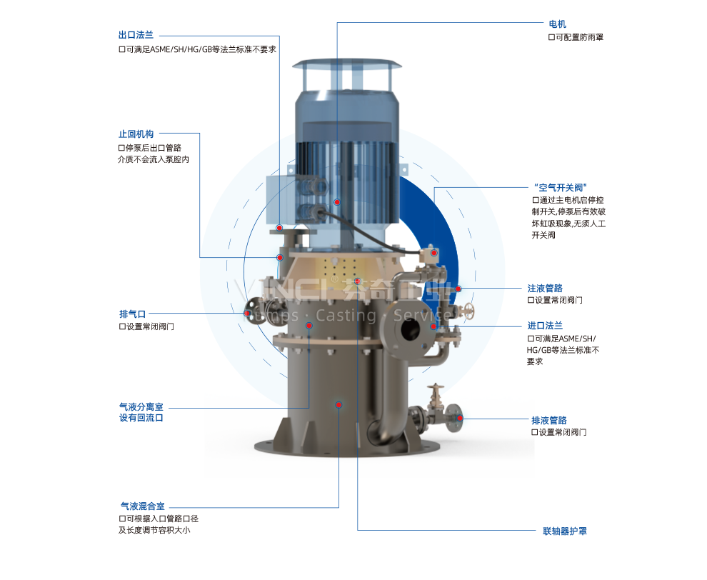 VZX - S 是一種水環(huán)自控式強(qiáng)自吸泵,由獨(dú)立的水環(huán)真空泵+離心泵+控制箱以及自吸裝置組成,首次啟動(dòng)前灌泵后續(xù)啟動(dòng)不再罐泵。啟動(dòng)時(shí)只需要按下控制箱啟動(dòng)按鈕,水環(huán)真空泵開始工作抽空吸入管路,整個(gè)離心泵充滿介質(zhì)后,自吸裝置自動(dòng)連鎖,水環(huán)真空泵電機(jī)斷電,水環(huán)真空泵停止工作,同時(shí)給主電機(jī)供電,離心泵開始工作。停泵后吸入管路及離心泵中的水位自動(dòng)回落。該泵組可以實(shí)現(xiàn)自動(dòng)啟泵、停泵等一系列操作。